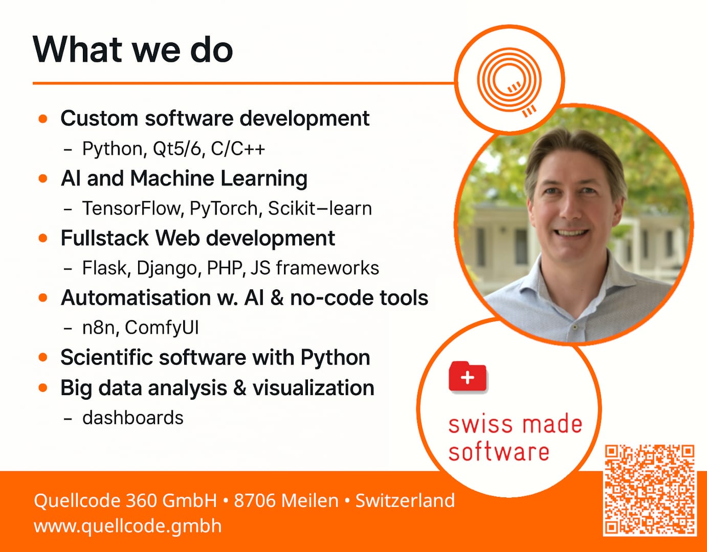 We are an IT company based in Meilen (ZH) and specialize in individual IT solutions. We support SMEs, individual companies, research institutions and start-ups in their digital transformation - from individual software and web development, app and e-commerce solutions to IT consulting, AI strategies and scientific software development. We also plan and implement hardware, network and infrastructure solutions and offer a fast on-site service in the Zurich area.